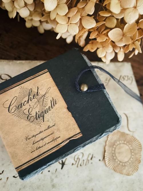 The labels are housed in a small hand-dyed, waxed paper book-style box, closed with a soft black ribbon.